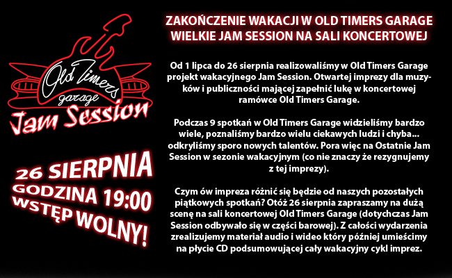 W najbliższy piątek (26.08.2011 godz. 19:00) w Old Timers Garage będzie miało miejsce zakończenie wakacji oraz ostatnie wakacyjne Jam Session. Na całą imprezę obowiązuje wstęp wolny!