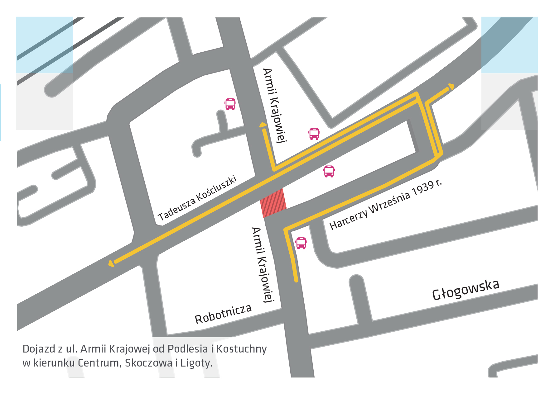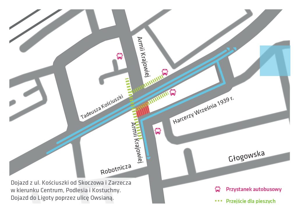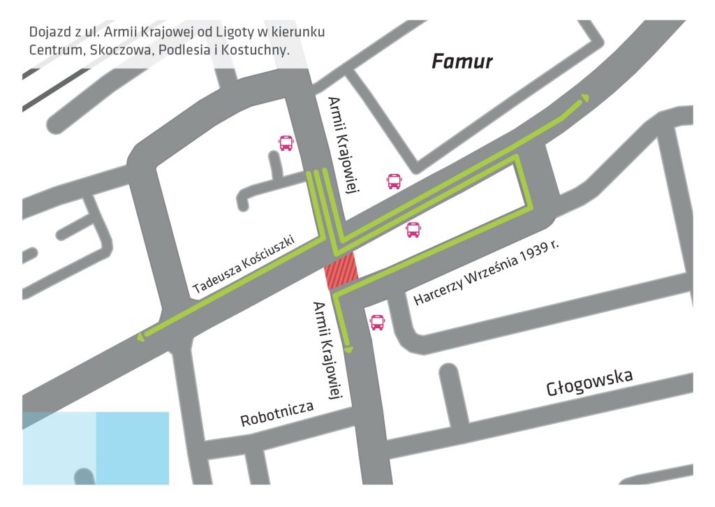 - kierunek do Podlesia, Kostuchny, Ochojca od Ligoty w lewo z ul. Armii Krajowej w ul. Kościuszki, w prawo z ul. Kościuszki w łącznik drogowy i ul. Harcerzy Września.