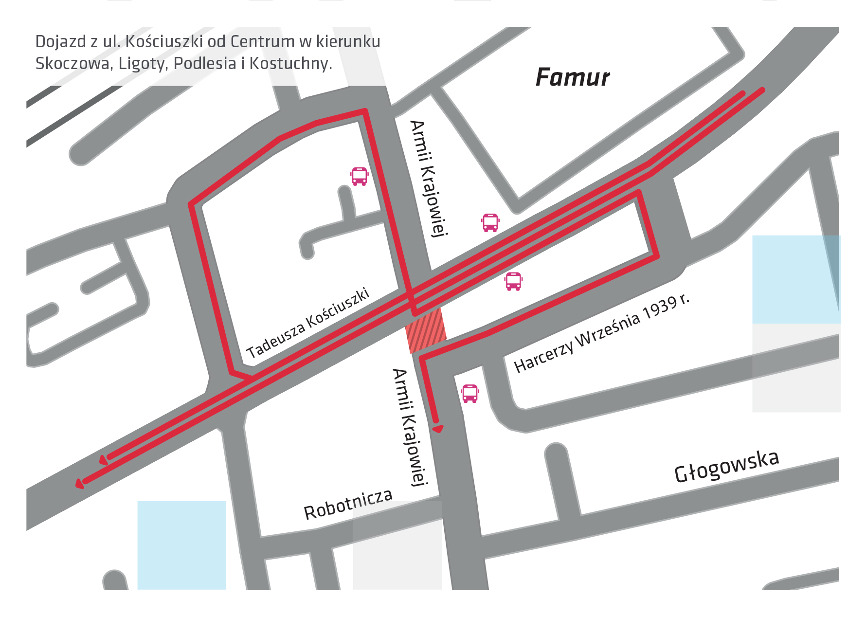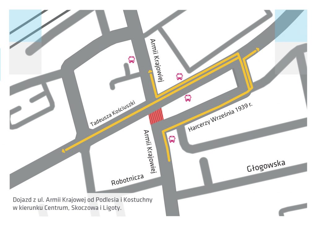 - kierunek do Podlesia, Kostuchny, Ochojca od Centrum – odbywać się będzie objazdem ulicami: najpierw na wprost na skrzyżowaniu Armii Krajowej – Kościuszki, następnie w prawo ulicą Małachowskiego, w prawo ulicą AK, w lewo do Kościuszki, następnie w prawo w łącznik ulic Harcerzy Września – Kościuszki, w prawo w Harcerzy Września do ulicy AK,